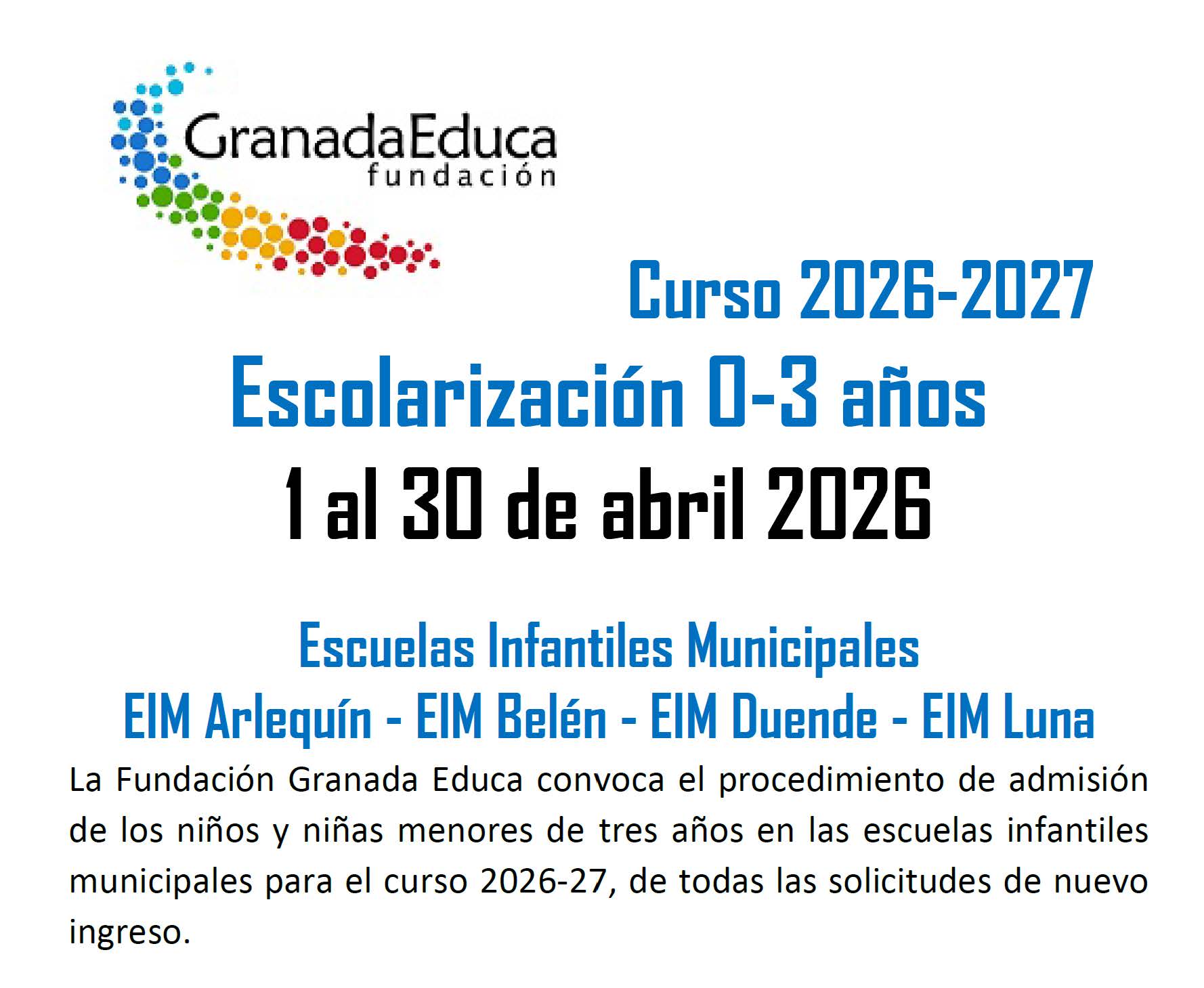 La Fundación Pública Local Granada Educa es una Organización sin ánimo de lucro, constituida como un ente instrumental del Ayuntamiento de Granada. En 1980, el Ayuntamiento de Granada decide crear el Patronato Municipal de Escuelas Infantiles con el fin de estudiar la realidad de la escolarización de los niños y niñas de 0-6 años en la ciudad de Granada y promover la creación de Escuelas Infantiles públicas de calidad. En 2008 se constituye como Fundación Pública Local Granada Educa.